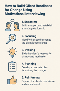 Before they act, clients need to feel ready. Readiness for change is a client’s level of preparedness to alter behavior, thoughts, emotions. MI examines this readiness and supports it as clients move through improvement step by step.